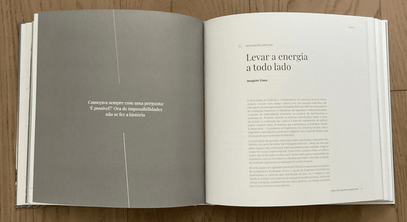 The iconic design of Casa da Música, a structural wonder in Porto, was manifested in every component of the undertaking: ranging from picture frames to guiding eye lines. This tribute book was crafted for Casa da Música, an endeavor that tested the boundaries of Engineering with its magnificence and irregular architecture.