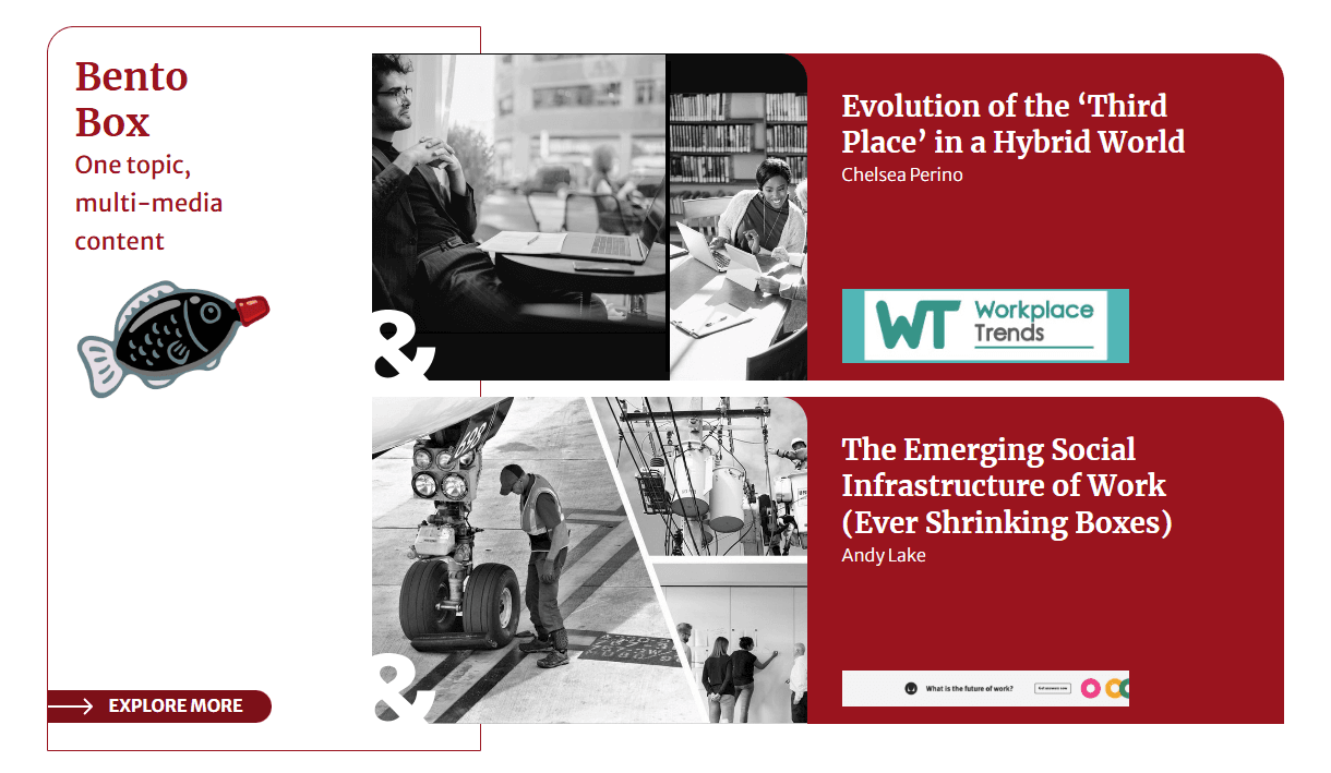 → The exclusive 'Bento Box' feature detailed above is a curated collection of multimedia around a singular theme. It was reimagined to facilitate seamless navigation between varying content. Its name borrows from the Japanese meal boxes, allowing diverse flavor combinations, and humorously, the soy sauce fish embodies the name. From the homepage, the user can view the latest duo of bento boxes while more can be discovered through the button. Upon selecting a content piece, a frictionless, user-friendly presentation of all the multimedia selections is displayed. Users only need to log in via LinkedIn to gain complete access.